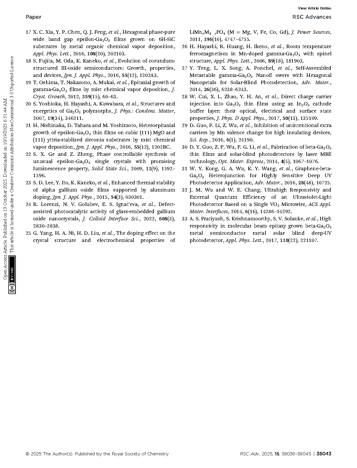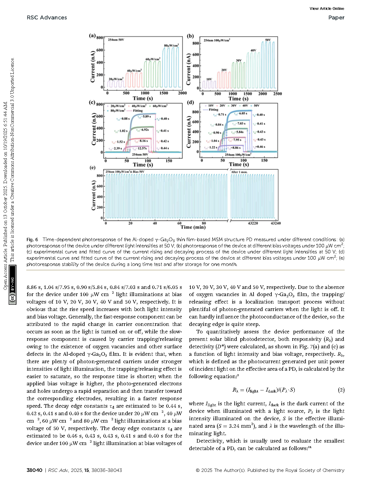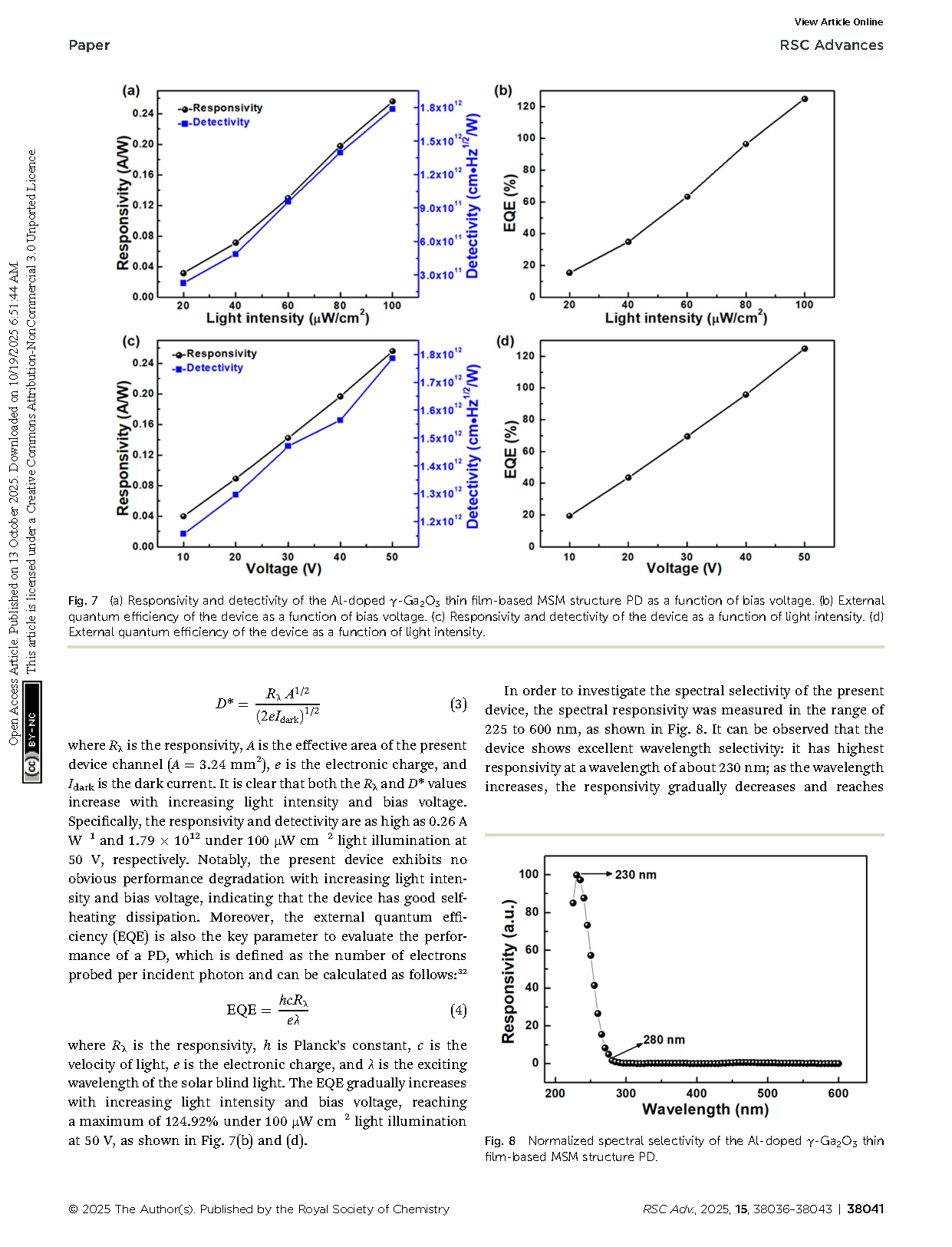 ● 成功制备出兼具高响应度、高探测率和亚秒级快速响应的 γ-Ga2O3 日盲探测器,其综合性能在同类器件中处于领先水平。