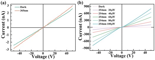 图 5 (a)在暗态和 365 nm 光照射下,基于掺铝 γ-Ga2O3 薄膜的 MSM 结构光电二极管的 I-V 特性。(b)在暗态和不同光强的 254 nm 光照射下,该器件的 I-V 特性。