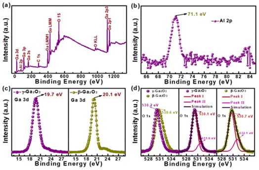 图 4 (a)掺铝 γ-Ga2O3 薄膜的 XPS 宽扫描光谱和(b)Al 2p 的核心能级。掺铝 γ-Ga2O3 和未掺杂 β-Ga2O3 薄膜的(c)Ga 3d 和(d)O 1s 的核心能级。
