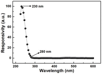 图 8 为掺铝 γ-Ga2O3 薄膜基 MSM 结构光电探测器的归一化光谱选择性。