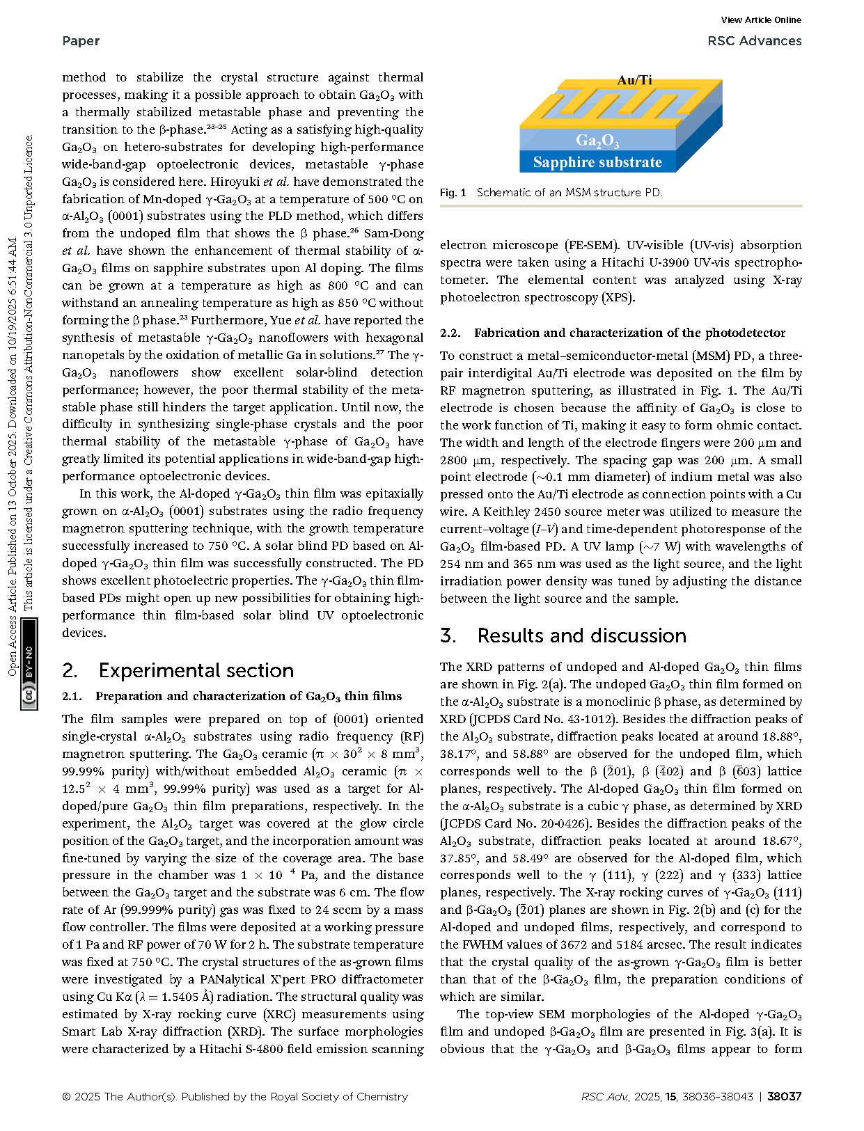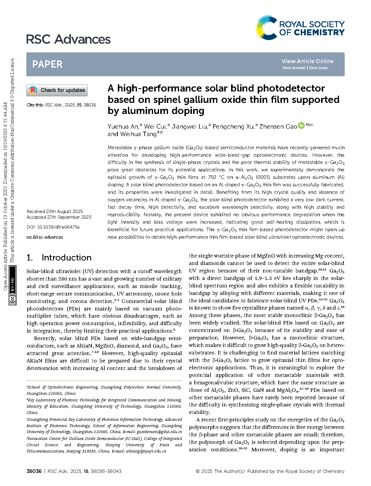 由广东技术师范大学的研究团队在学术期刊 RSC Advances 发布了一篇名为 A high-performance solar blind photodetector based on spinel gallium oxide thin film supported by aluminum doping(基于铝掺杂尖晶石氧化镓薄膜的高性能日盲光电探测器)的文章。