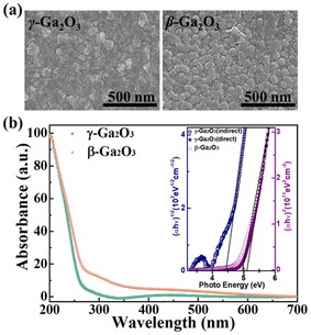 图 3 (a)掺铝 γ-Ga2O3 和未掺杂 β-Ga2O3 薄膜的扫描电子显微镜(SEM)图像。(b)掺铝 γ-Ga2O3 和未掺杂 β-Ga2O3 薄膜的紫外-可见吸收光谱,插图为(αhν)2 和(αhν)1/2 与 hν 的关系图。