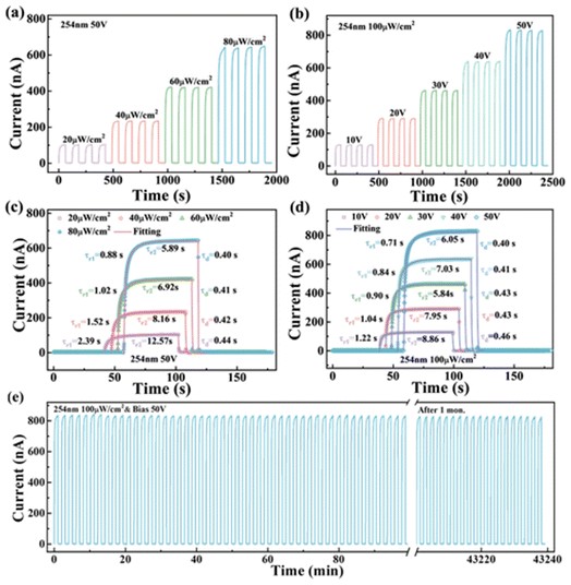 图 6 为不同条件下基于掺铝 γ-Ga2O3 薄膜的 MSM 结构光电探测器的时变光响应:(a)在 50 V 电压下不同光强下的器件光响应;(b)在 100 μW cm2 光强下不同偏置电压下的器件光响应;(c)在 50 V 电压下不同光强下器件电流上升和衰减过程的实验曲线和拟合曲线;(d)在 100 μW cm2 光强下不同偏置电压下器件电流上升和衰减过程的实验曲线和拟合曲线;(e)长时间测试及存储一个月后器件的光响应稳定性。