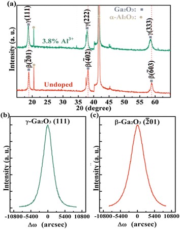 图 2 (a)未掺杂和铝掺杂的 Ga2O3 薄膜的 XRD 图谱。X 射线摇摆曲线:(b)铝掺杂薄膜的 γ-Ga2O3(111)和(c)未掺杂薄膜的 β-Ga2O3(-201)。