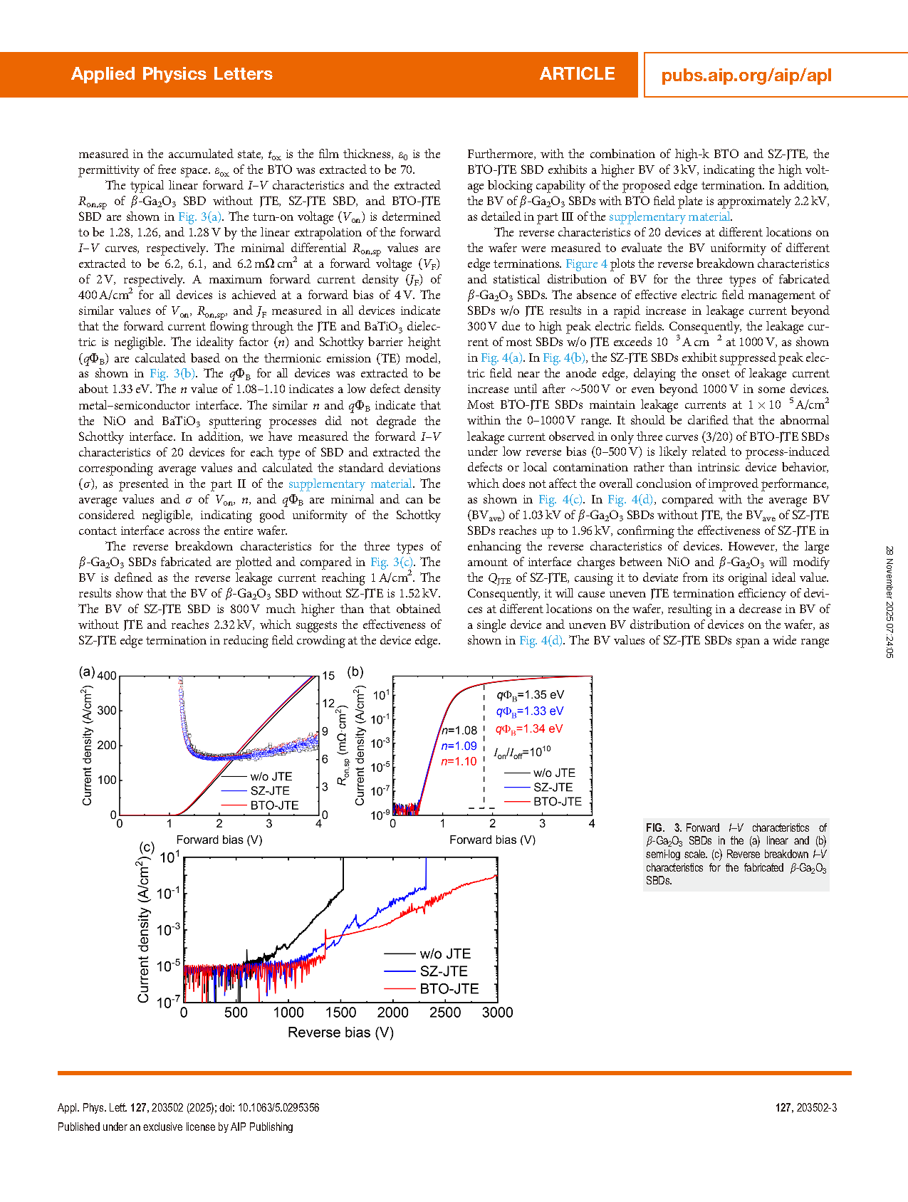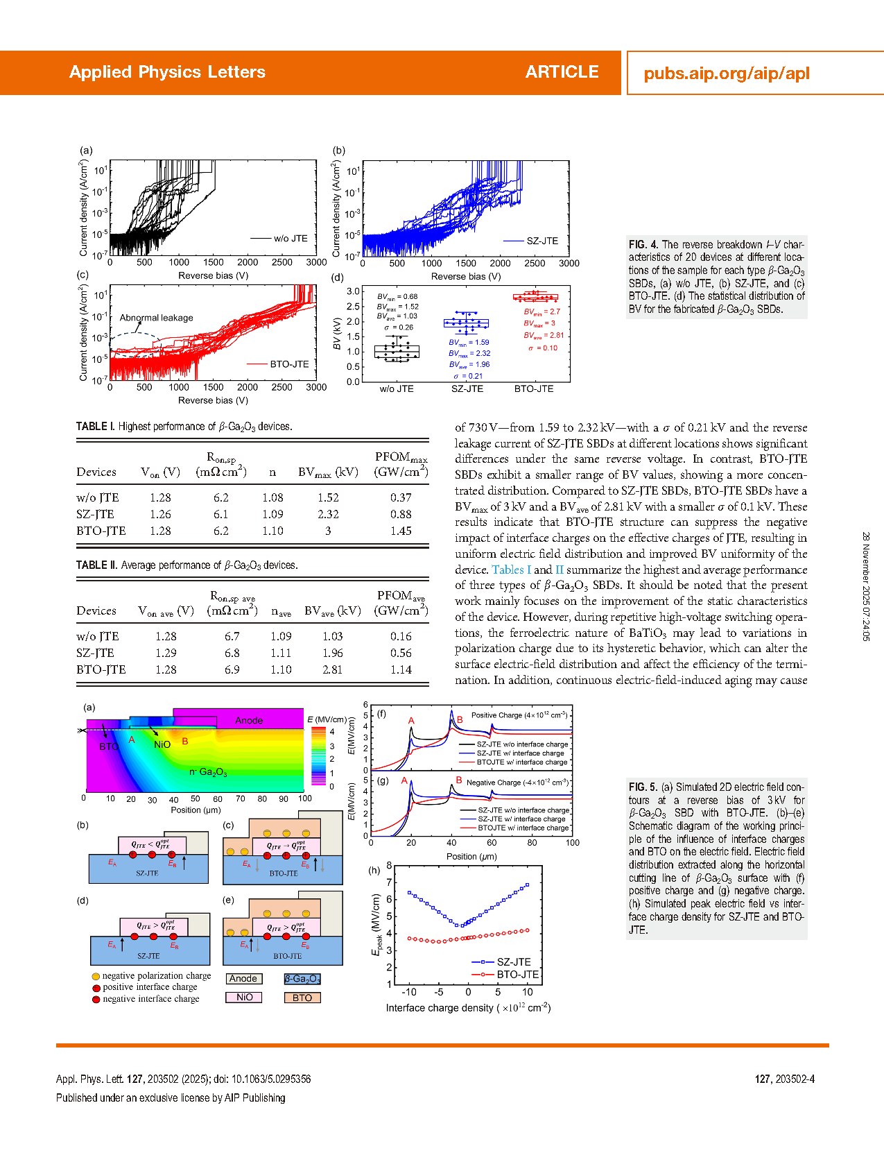 研究团队成功制备了高性能 β-Ga2O3 肖特基二极管,其高介电常数 BaTiO3 介质增强了JTE的效率,展现出对正负界面电荷的宽容度。实验与模拟结果均证实了其对界面电荷的击穿电压敏感性显著降低。采用 BTO-JTE 技术的 β-Ga2O3 肖特基二极管保持 2.81 kV 平均击穿电压的同时,显著提升了界面电荷容差。这些改进使 BTO-JTE 展现出更强的抗界面电荷干扰能力。本研究表明,BTO-JTE 技术是实现高压 β-Ga2O3 器件极具前景的边缘封装方案。