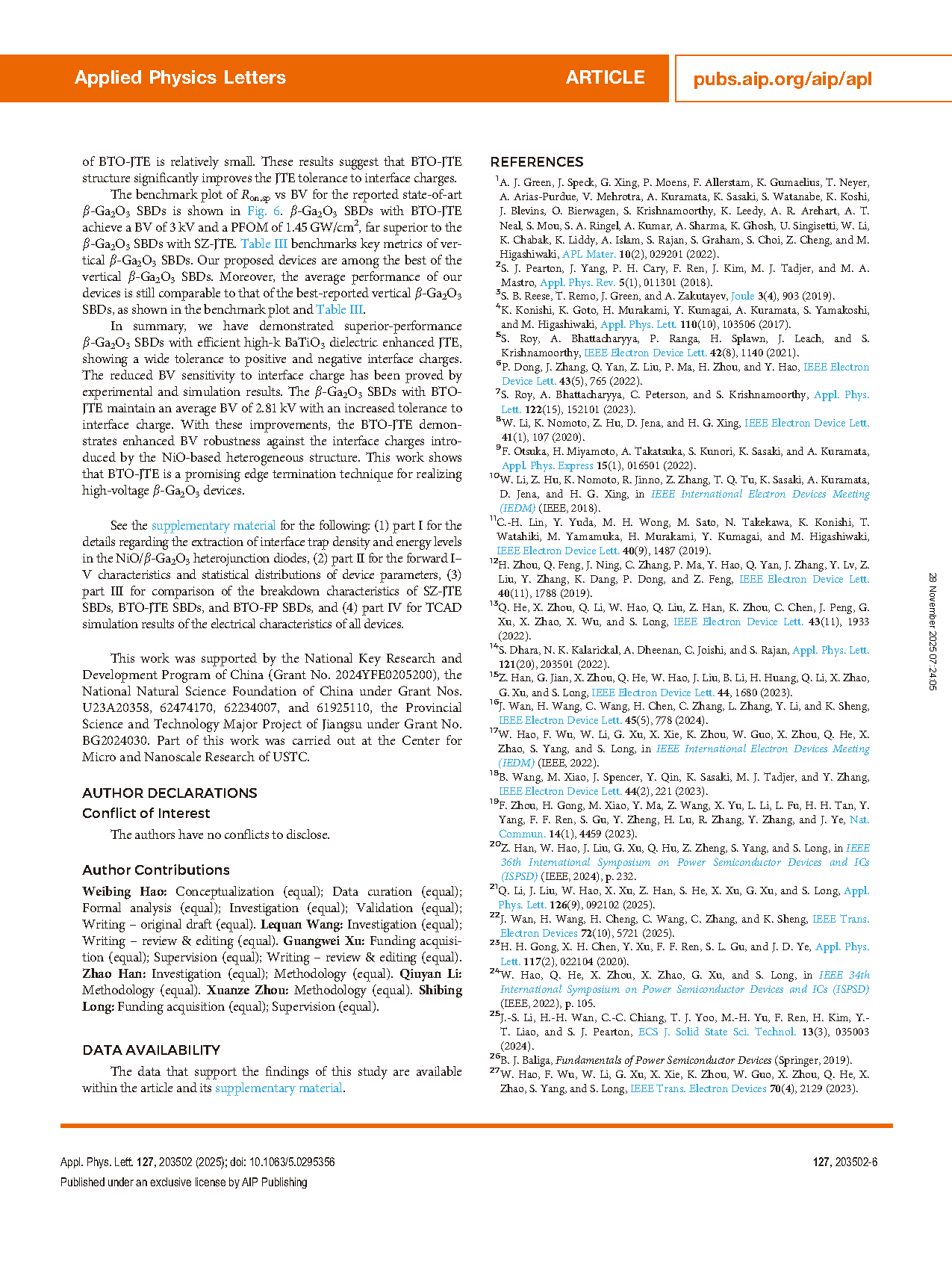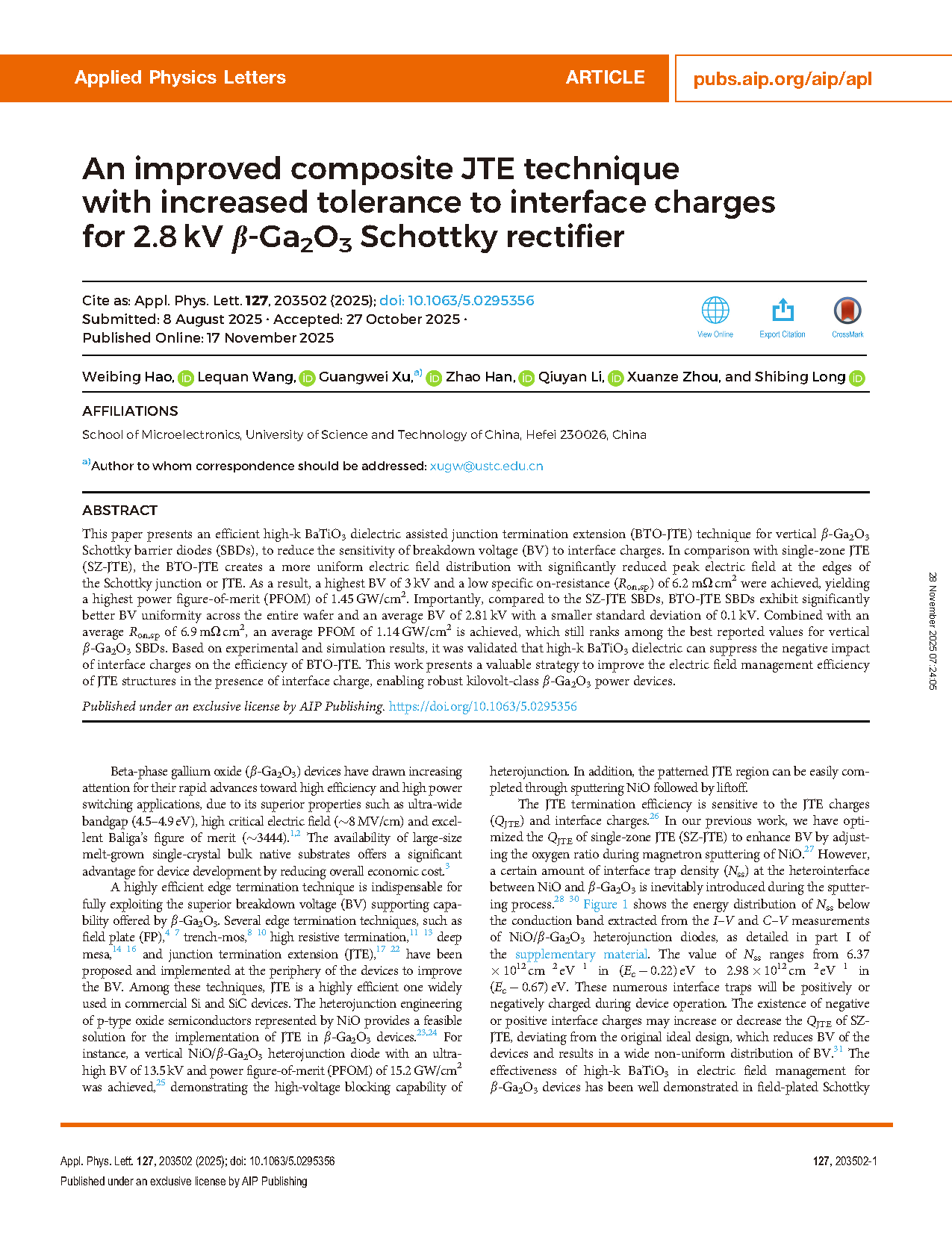 由中国科学技术大学龙世兵教授的研究团队在学术期刊 Applied Physics Letters 发布了一篇名为 An improved composite JTE technique with increased tolerance to interface charges for 2.8 kV β-Ga2O3 Schottky rectifier(2.8 kV β-Ga2O3 肖特基整流器的改进型复合 JTE 技术增强了对界面电荷的容忍度)的文章。