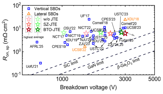 图6. 已报道的先进β-Ga2O3 SBD 的 Ron,sp 与 BV 基准曲线图。