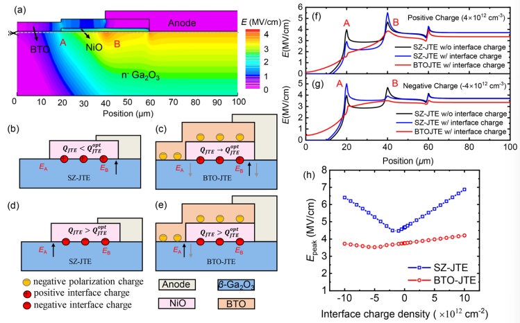图5. (a) 采用 BTO-JTE 的 β-Ga2O3 反向偏压为 3 kV 时的二维电场等值线模拟图。(b)–(e) 界面电荷与 BTO 对电场影响的工作原理示意图。(f) β-Ga2O3 表面沿水平截面线提取的正电荷分布,(g) 负电荷分布。(h) SZ-JTE 与 BTO-JTE 器件中模拟峰值电场与界面电荷密度的关系曲线。