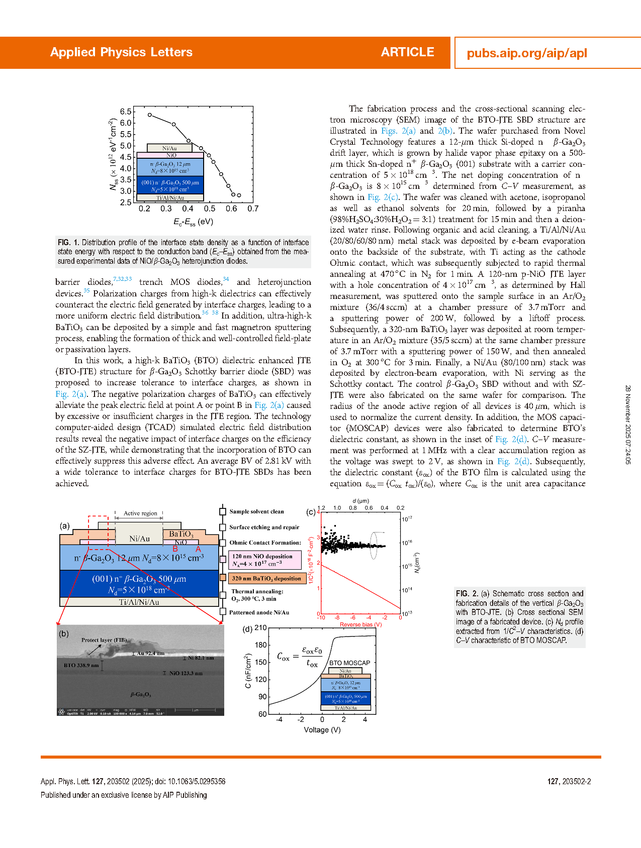 本文提出了一种高效的高介电常数 BaTiO3 介质辅助结端部延伸(BTO-JTE)技术,适用于垂直 β-Ga2O3 肖特基势垒二极管(SBD),旨在降低击穿电压(BV)对界面电荷的敏感性。与单区结点延伸技术(SZ-JTE)相比,BTO-JTE 技术能形成更均匀的电场分布,显著降低肖特基结或结点延伸区域边缘的峰值电场强度。由此实现最高 BV 值 3kV 与低静态导通电阻 (Ron,sp) 6.2mΩ·cm2,最高功率优值 (PFOM) 达 1.45GW/cm2。值得注意的是,相较于 SZ-JTE 肖特基二极管,BTO-JTE 肖特基二极管在整个晶圆上展现出显著更优的击穿电压均匀性,平均击穿电压达 2.81 kV 。结合平均 Ron,sp 值 6.9 mΩ·cm2,最终获得平均 PFOM 值 1.14 GW/cm2,该数值仍位居垂直 β-Ga2O3 结型二极管已报道最佳值之列。实验与仿真结果验证了高介电常数 BaTiO3 介质可有效抑制界面电荷对 BTO-JTE 效率的负面影响。本研究提出了一种在界面电荷存在下提升 JTE 结构电场管理效率的有效策略,为实现坚固的千伏级 β-Ga2O3 功率器件奠定了基础。