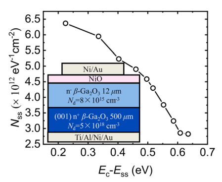 图1. 基于 NiO/β-Ga2O3 异质结二极管实验测量数据获得的界面态密度分布曲线,该曲线以界面态能量相对于导带的值(Ec–Ess)为横坐标。