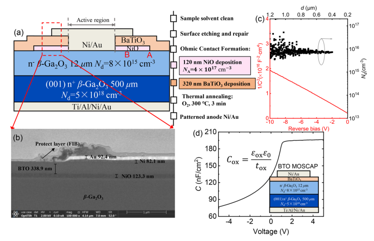 图2. (a) 垂直 β-Ga2O3 与 BTO-JTE 的示意截面图及制备细节。(b) 制备器件的截面扫描电子显微镜图像。(c) 从 1/C2-V 特性曲线提取的钕分布曲线。(d) BTO MOSCAP 的 C-V 特性曲线。