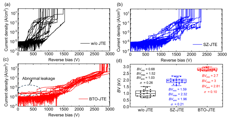 图4. 不同类型β-Ga2O3 SBD 样品中 20 个器件在不同位置的反向击穿 I-V 特性曲线:(a)普通二极管,(b) SZ-JTE二极管,(c) BTO-JTE二极管。图 (d) 为制备的 β-Ga2O3 SBD 的击穿电压统计分布。