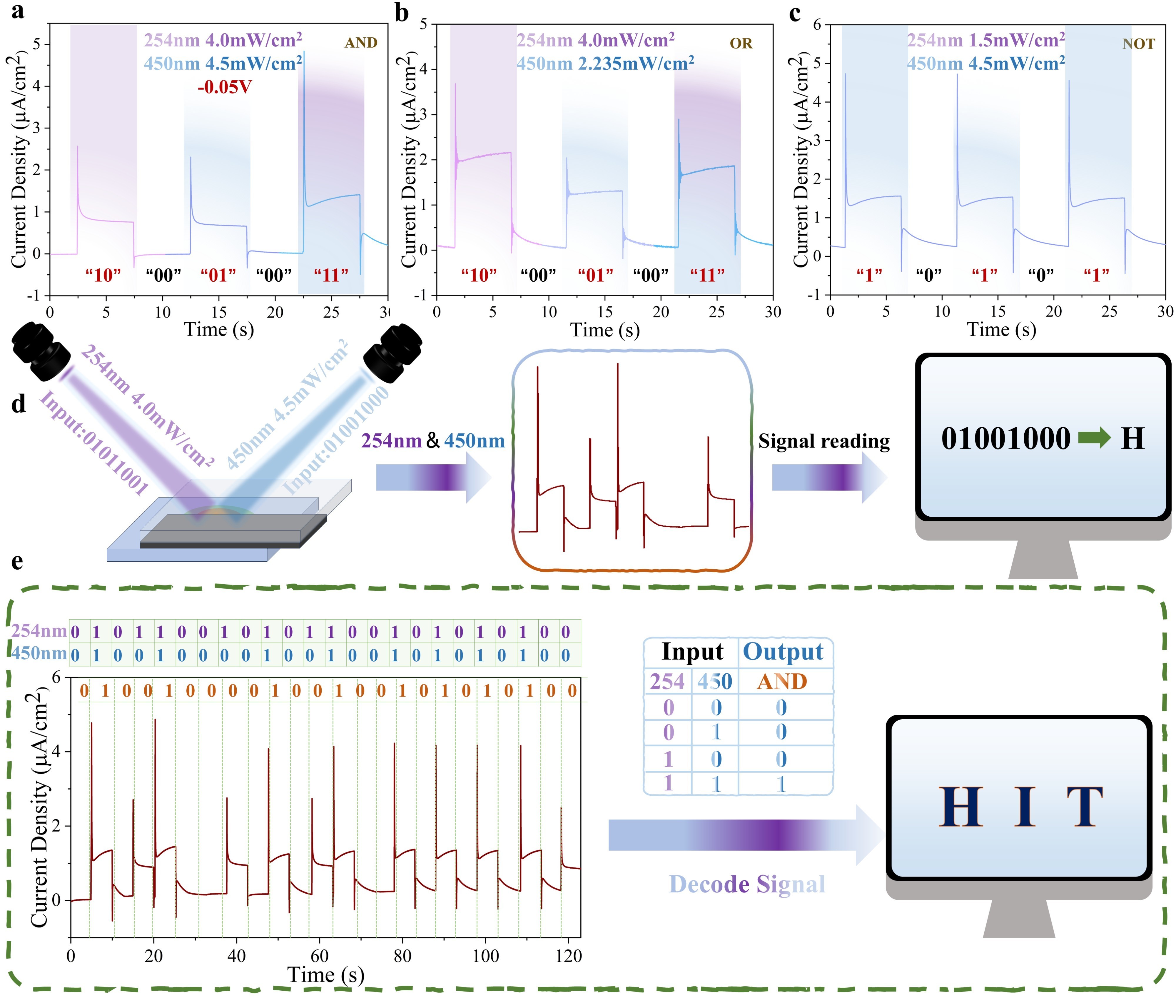 受益于这一独特机制,团队在单一器件上仅通过调节光波长、光功率和偏压便实现了“AND”、“OR”、“NOT”三种可编程逻辑门。进一步,他们用254 nm与450 nm双光源作为输入通道,以光电流密度阈值作为输出电平,成功将二进制码“01011001”与“01001000”编码为“HIT”字符并在接收端完整解码,首次在PEC平台上完成光通信演示。