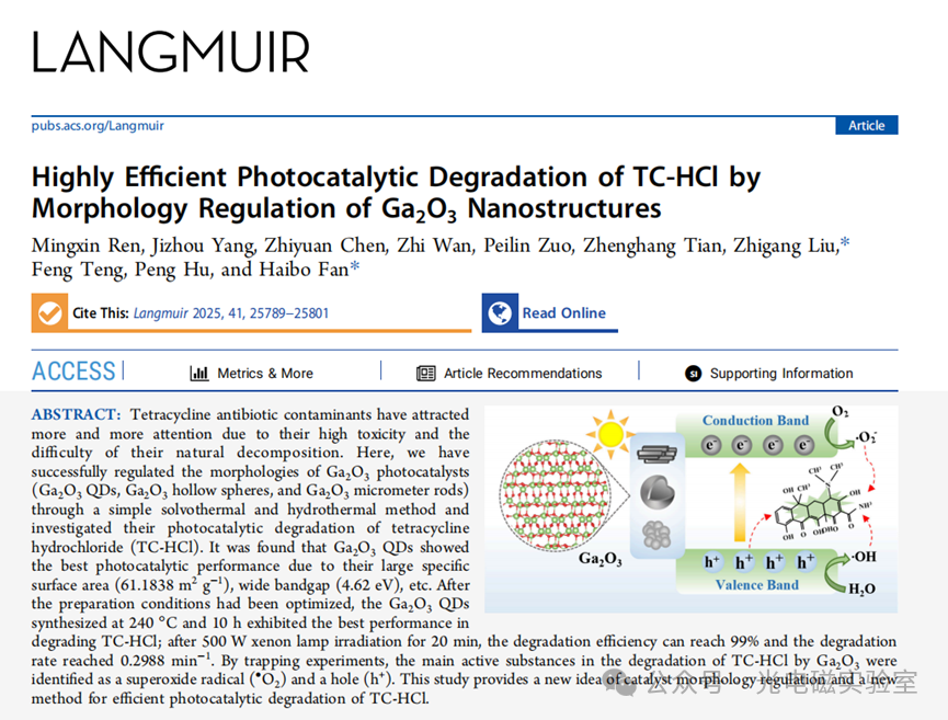 【国内论文】LANGMUIR∣课题组通过对Ga₂O₃纳米材料进行形貌调控实现对盐酸四环素的高效光催化降解
