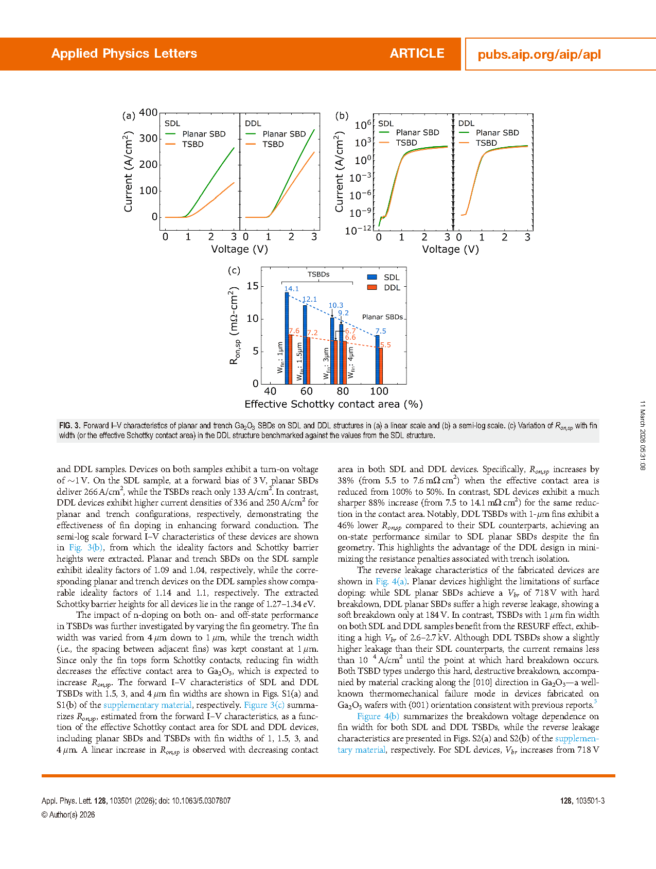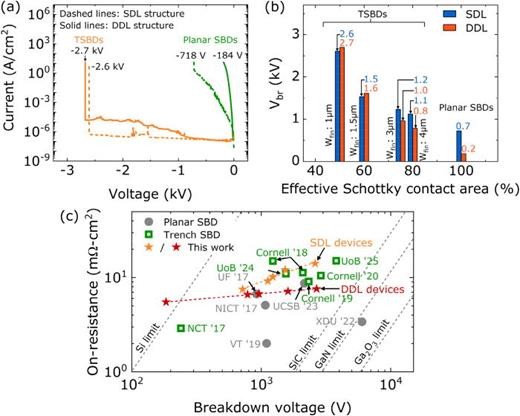 图4. (a) 基于 SDL 和 DDL 样品制备的平面型与沟槽型 Ga2O3 SBD 的反向漏电流特性曲线。(b) 不同 fin 宽度器件的击穿电压值汇总(精确至小数点后一位)。(c) 本研究中 Ron,sp 与 Vbr 值与文献报道的对比分析,重点展示 SDL 与 DDL 结构中的权衡轨迹。