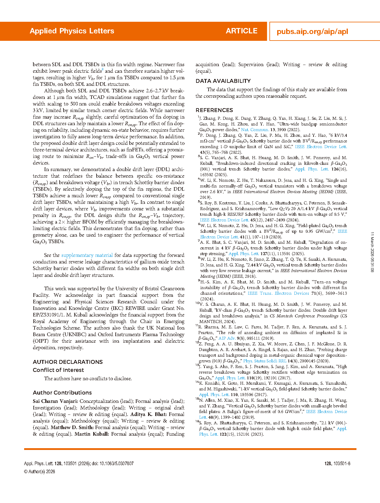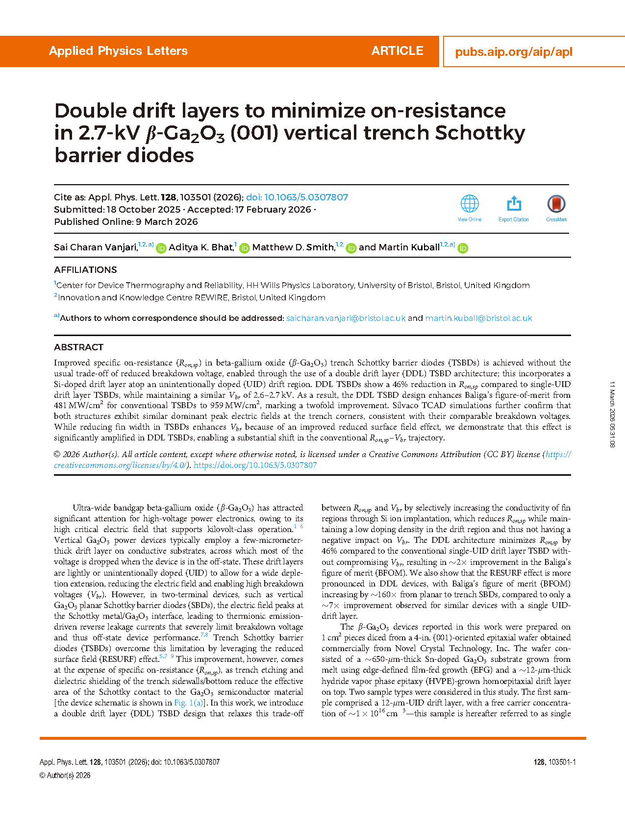 由英国布里斯托大学的研究团队在学术期刊 Applied Physics Letters 发布了一篇名为 Double drift layers to minimize on-resistance in 2.7-kV β-Ga2O3 (001) vertical trench Schottky barrier diodes(双漂移层结构用于最小化 2.7kV β-Ga2O3 (001)垂直沟槽肖特基势垒二极管的导通电阻)的文章。