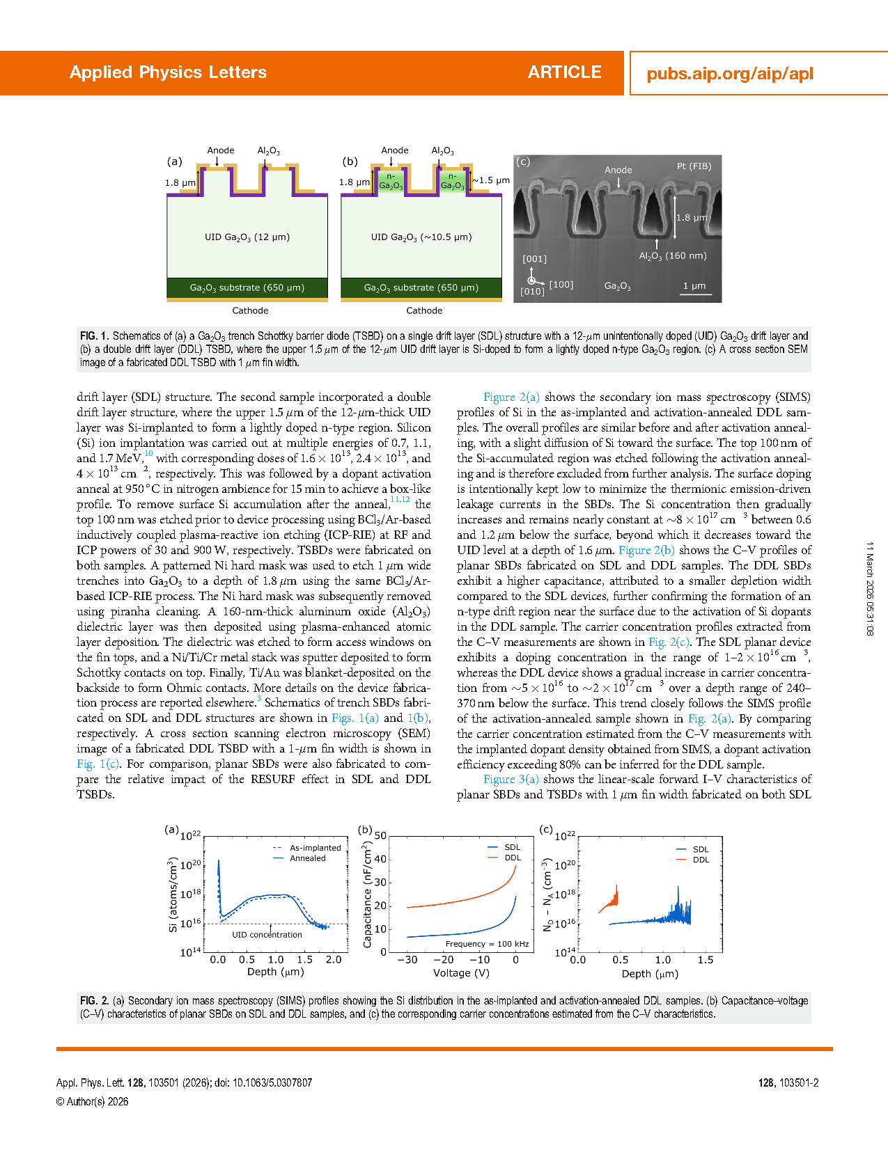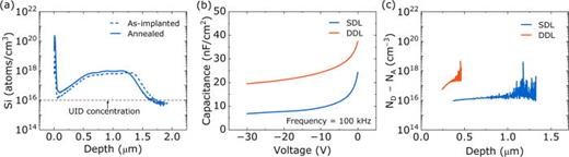 图2. (a) 二次离子质谱(SIMS)剖面图,显示注入后及活化退火处理的DDL样品中硅的分布情况。(b) SDL 和 DDL 样品上平面 SBD 的电容-电压(C-V)特性曲线,以及(c) 根据 C-V 特性估算的对应载流子浓度。