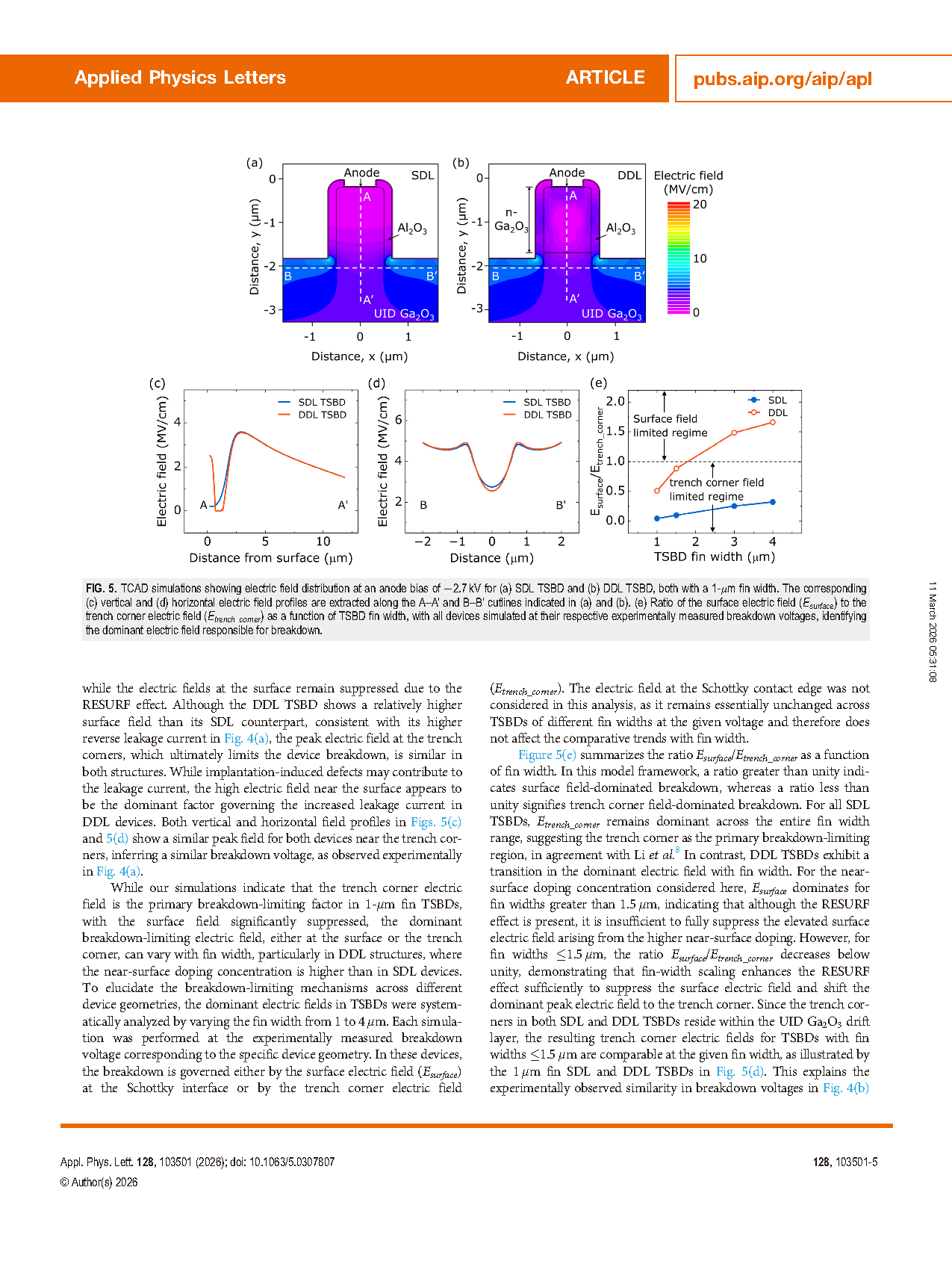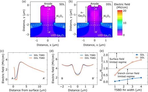 图5. TCAD 模拟显示在阳极偏压为 −2.7 kV 时,(a) SDL TSBD 和 (b) DDL TSBD 的电场分布,两者均采用 1 μm fin 宽度。沿 (a) 和 (b) 中标示的 A–A' 与 B–B' 剖面线提取的对应 (c) 垂直及 (d) 水平电场分布曲线。(e) 随 TSBD fin 宽度变化,表面电场 (Esurface) 与沟槽拐角电场 (Etrench_corner) 之间比值的关系曲线,所有器件均在各自实验测得的击穿电压下进行模拟,从而识别出导致击穿的主导电场。