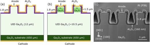 图1. (a) 单漂移层(SDL)结构上的 Ga2O3 沟槽肖特基势垒二极管(TSBD),其具有 12 μm 非故意掺杂 (UID) Ga2O3 漂移层;(b) 双漂移层(DDL) TSBD 结构,其中 12 μm UID 漂移层的上部 1.5 μm 经硅掺杂形成轻掺杂 n 型 Ga2O3 区域;(c) 制备的 DDL TSBD 截面 SEM 图像,其 fin 宽度为 1 μm。