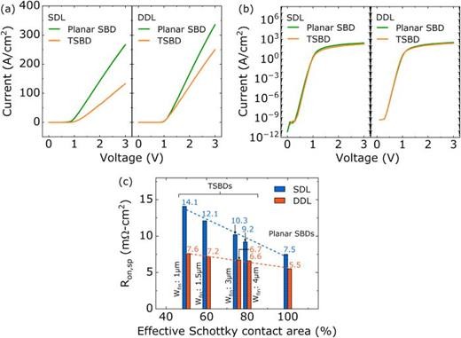 图3. 基于 SDL 和 DDL 结构的平面式与沟槽式 Ga2O3 SBD 正向 I-V 特性曲线:(a)线性坐标系;(b)半对数坐标系。(c)DDL 结构中 Ron,sp 随栅极宽度(或有效肖特基接触面积)的变化趋势,与SDL结构数据进行对比。