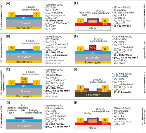 图5. 具有各种代表性β-Ga2O3纳米膜场效应器的示意图,包括(A,B)底栅MOSFET,(C)底栅MOSFET和顶栅MESFET。(D)双门MESFET,(E)底门MESFET,(F)顶门JFET,(G)底门JFET,和(H)伏极底门JFET。对于每个β-Ga2O3纳米膜场效应晶体管,总结了评价器件性能的参数,包括阈值电压(VTH)、最大漏极电流(Id,max)、Ion/Ioff比率、亚阈值斜率(SS)、最大跨导(gmmax)和击穿电压(Vbr)。