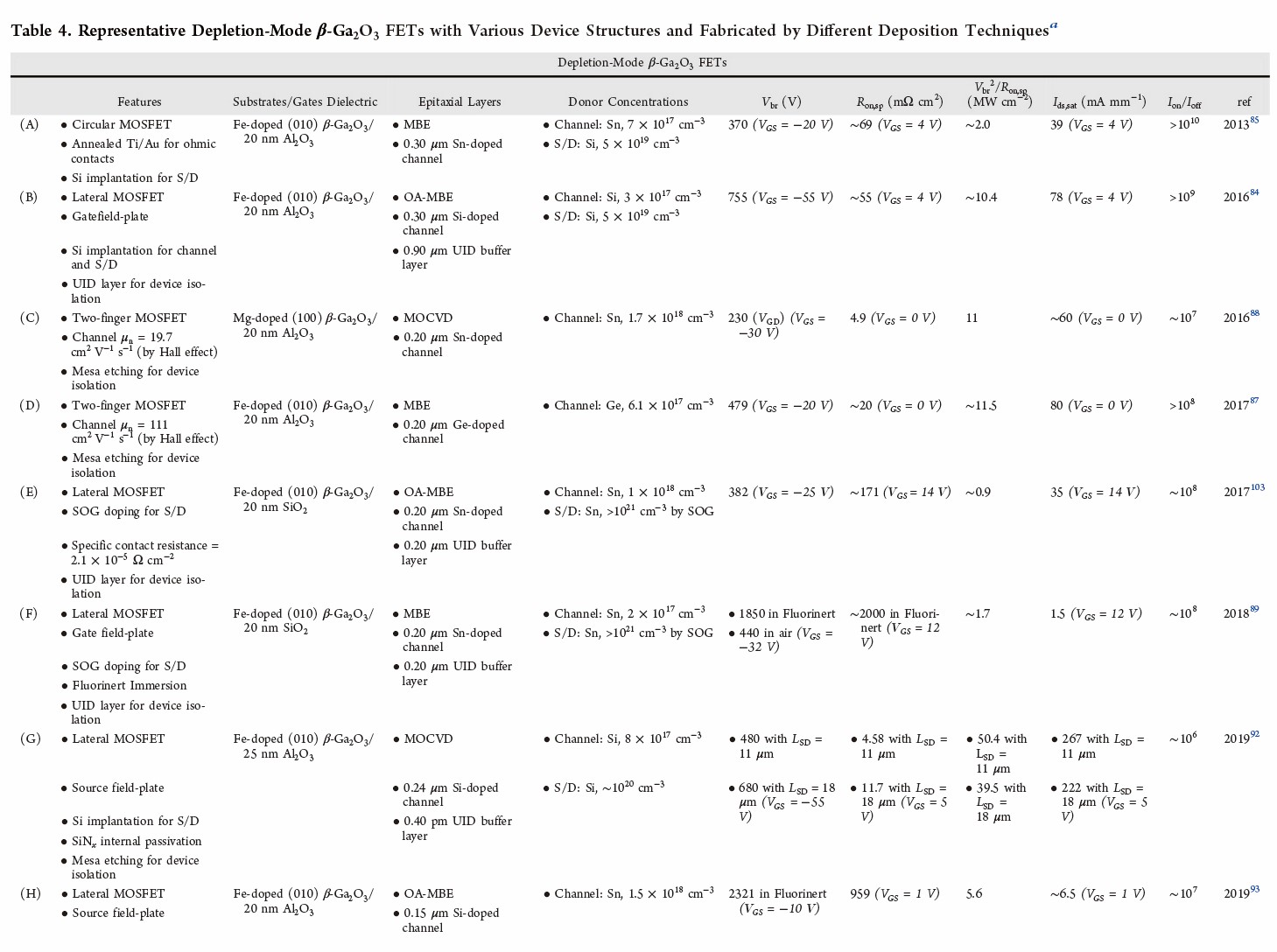 图3. 具有代表性的耗尽模式的β-Ga2O3 FET的截面图,包括(A)具有栅极连接场板的MOSFET,(B)具有源极连接场板的MOSFET,(C)具有sub-μm和凹陷栅极的MOSFET,(D)具有2DEG通道的异质结构FET。(E) 具有凹陷栅极的MOSFET,用于射频操作, (F) 具有自对准耐火栅极的双指MOSFET,用于射频操作,(G) 具有delta掺杂通道的MESFET,用于射频操作,和(H) 具有氧退火UID层的MOSFET,用于射频操作。