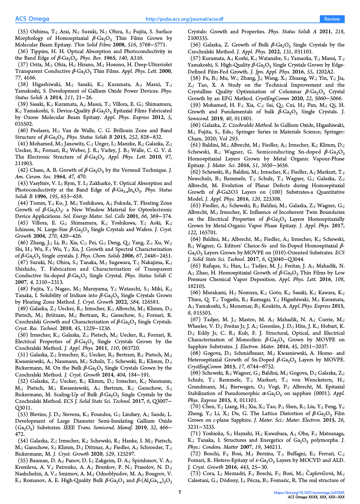 FZ法的起始材料是5N级的β-Ga2O3粉末,通过冷等静压工艺(50~300MPa)将其压成棒状。在晶体生长过程中,烧结的棒被放置在上轴上,与放置在下轴上的β-Ga2O3子晶体以相反的方向缓慢旋转。四个高功率(1.5kW)的卤素灯和相应的椭圆镜用作加热系统。在干燥空气或合成空气(21 vol % O2 + 79 vol % N2)流动下,生长速度为1-20 mm h-1。晶体生长过程在图2(A)中说明。FZ方法的主要问题是液态熔体的崩溃,它几乎不受表面张力的影响,以及由于高热梯度而在生长的晶体中形成裂缝。