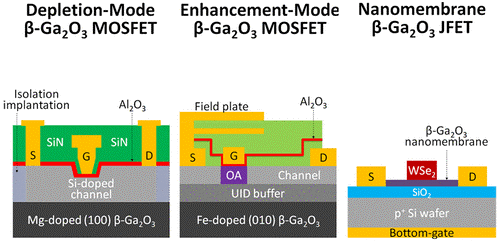 图4. 具有代表性的增强模式的β-Ga2O3 FET的截面图,包括(A)具有包覆栅极的FinFET,(B)具有狭窄UID通道的MOSFET,(C)具有氧退火通道和双源连接场板的MOSFET。(D) 具有凹陷栅极的MOSFET,(E) 具有8纳米薄沟道的底栅MOSFET,(F) 具有Fin沟道的MISFET,(G) 具有垂直电流孔的MOSFET,和(H) 具有N掺杂沟道的MOSFET。