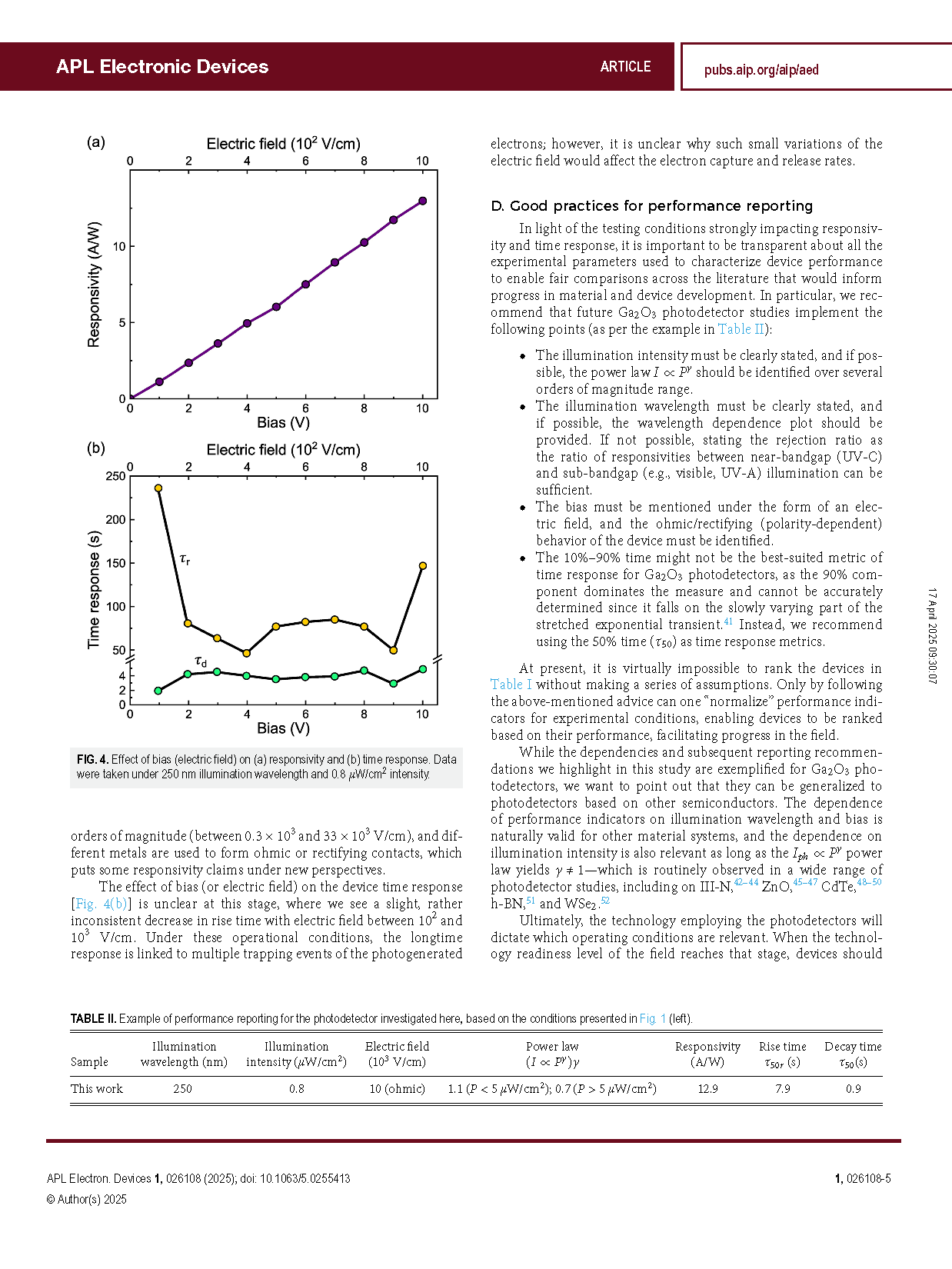 该研究解决了 Ga2O3 光探测器性能报告缺乏一致性的难题,并评估了光照强度、光照波长和电压偏置对光探测器响应度和时间响应的影响。该方法揭示了 Ga2O3 光探测器工作期间的电子过程,并对材料的缺陷光谱提供了定性见解。更重要的是,该研究强调了通过选择性使用测试条件可以人为制造出高性能的假象,并对报告性能时的不当做法提出了警告,这些做法可能导致误导性的比较。最后,该研究为未来报告光探测器性能的工作提出了建议,以实现性能的标准化,从而能够在文献中进行公平的比较。这些建议不仅适用于 Ga2O3,也可应用于其他半导体材料。