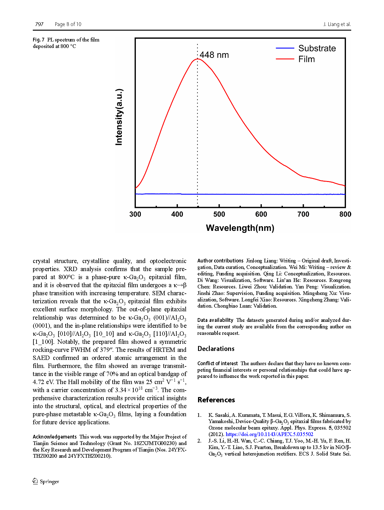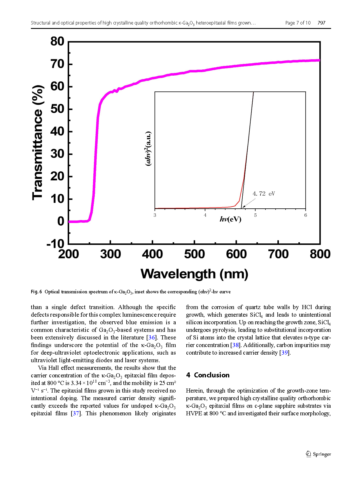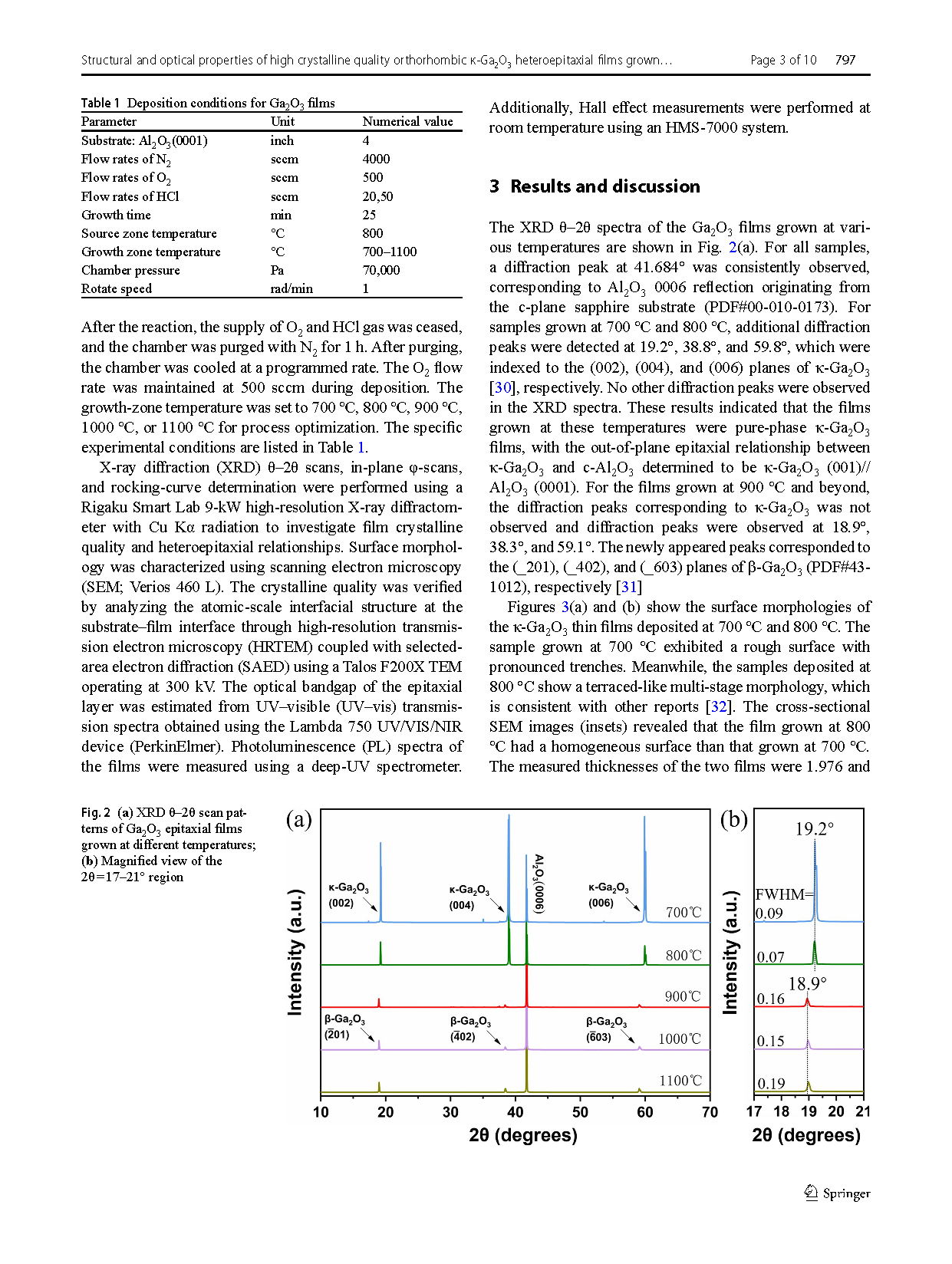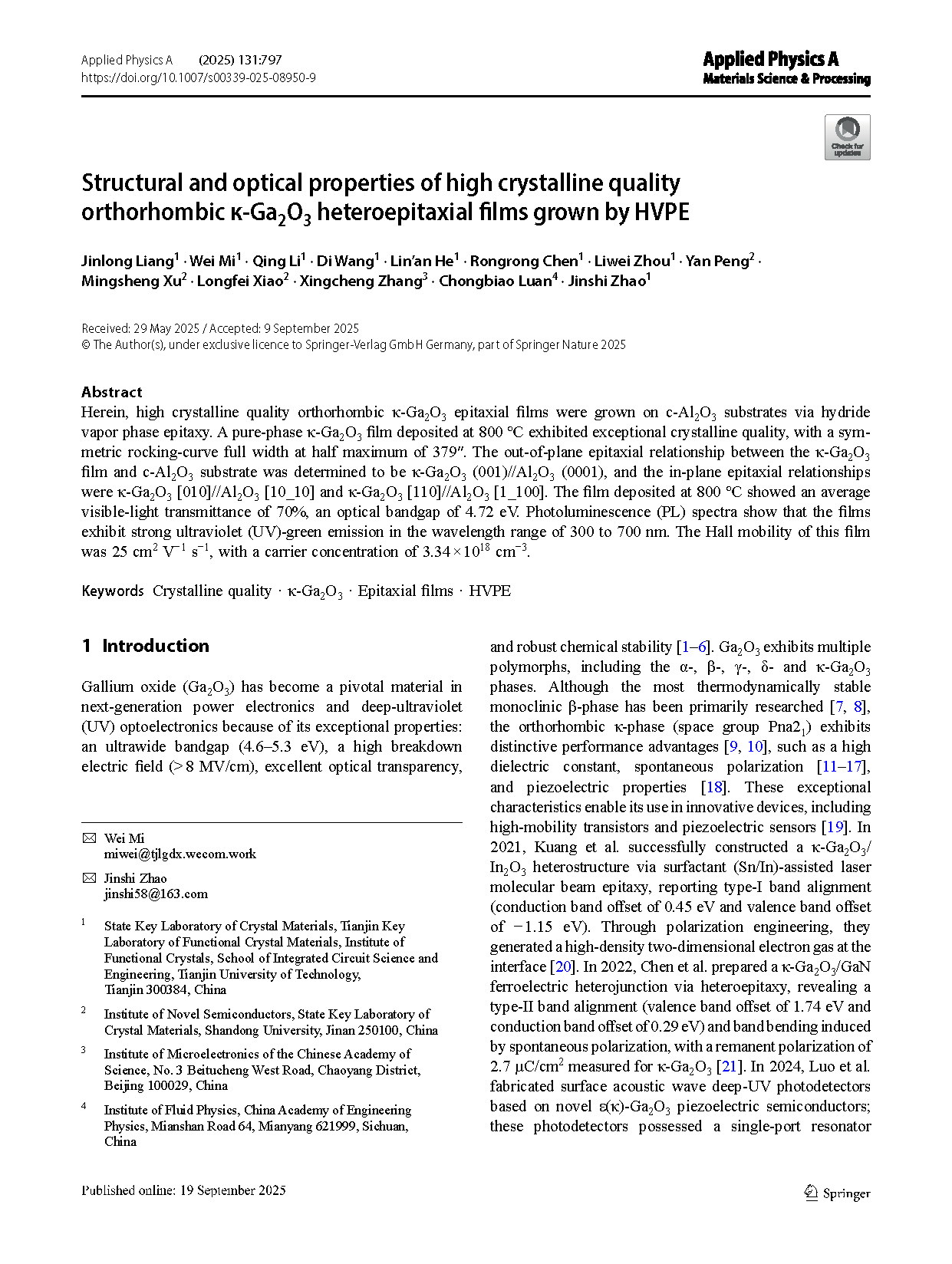 天津理工大学集成电路科学与工程学院的先进半导体器件及集成技术研究团队在学术期刊 Applied Physics A 发布了一篇名为“Structural and optical properties of high crystalline quality orthorhombic к-Ga2O3 heteroepitaxial films grown by HVPE”(通过HVPE法成功制备高质量正交结构 κ-Ga₂O₃ 异质外延薄膜)的文章。