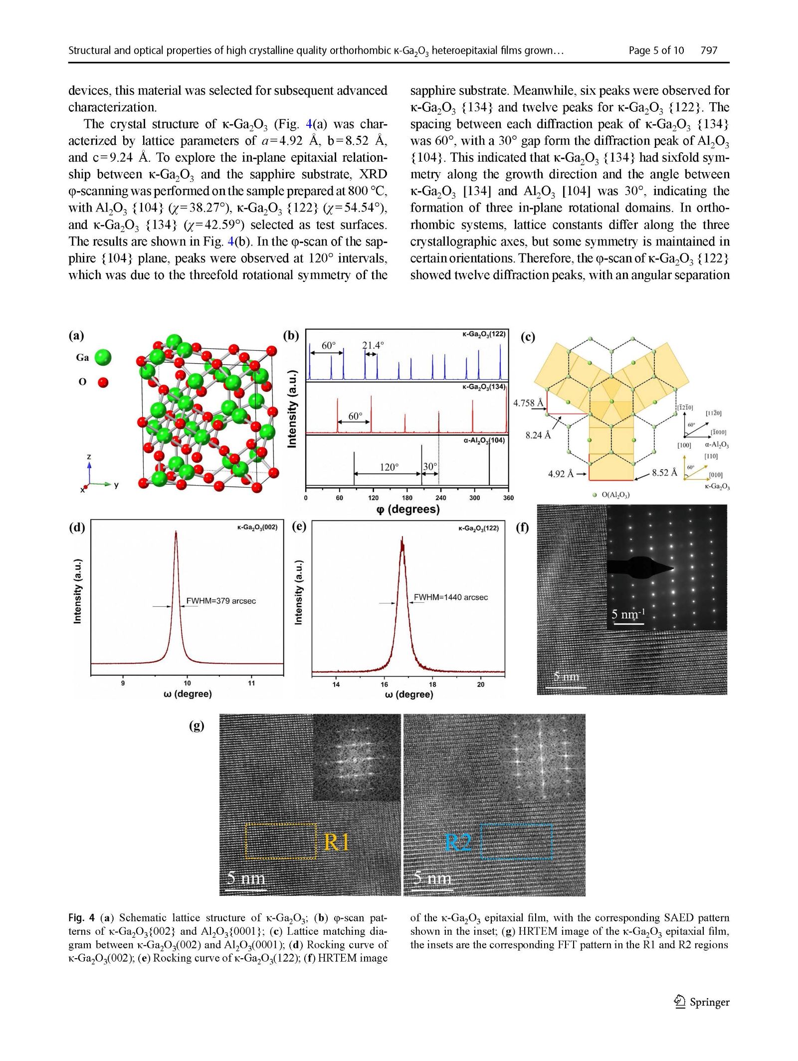 图 4 (a)κ-Ga2O3 的晶格结构示意图;(b)κ-Ga2O3 {002} 和 Al2O3{0001} 的 φ 扫描图样;(c)κ-Ga2O3(002) 与 Al2O3(0001) 的晶格匹配图;(d)κ-Ga2O3(002) 的摇摆曲线;(e)κ-Ga2O3(122) 的摇摆曲线;(f)κ-Ga2O3 外延薄膜的高分辨率透射电子显微镜(HRTEM)图像,插图为其对应的选区电子衍射(SAED)图样;(g)κ-Ga2O3 外延薄膜的 HRTEM 图像,插图分别为 R1 和 R2 区域的相应快速傅里叶变换(FFT)图样。