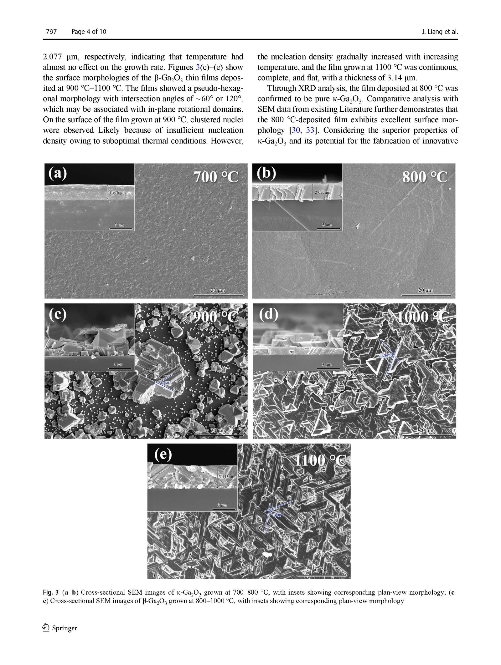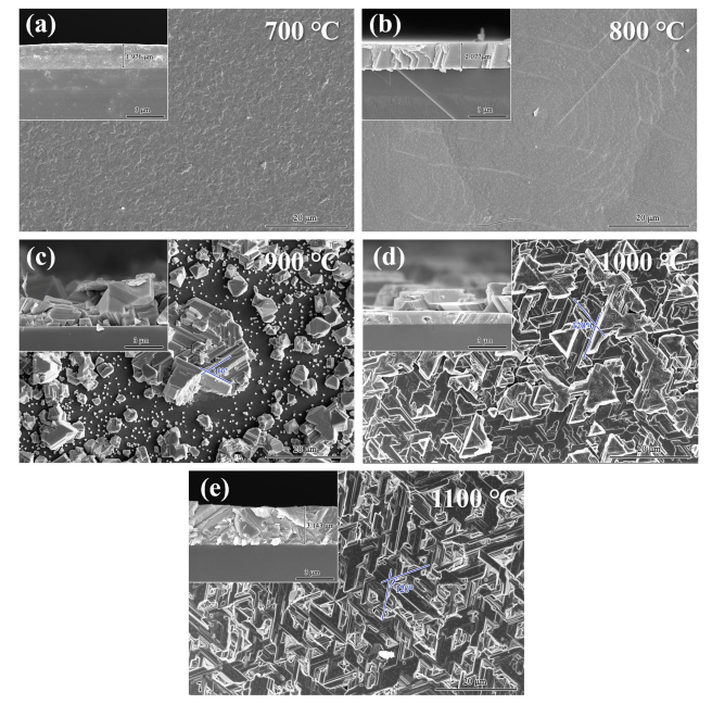 图 3(a–b)在 700–800 °C 下生长的 κ-Ga2O3 的截面扫描电子显微镜图像,插图显示相应的俯视图形态;(c–e)在 800–1000 °C 下生长的 β-Ga2O3 的截面扫描电子显微镜图像,插图显示相应的俯视图形态。