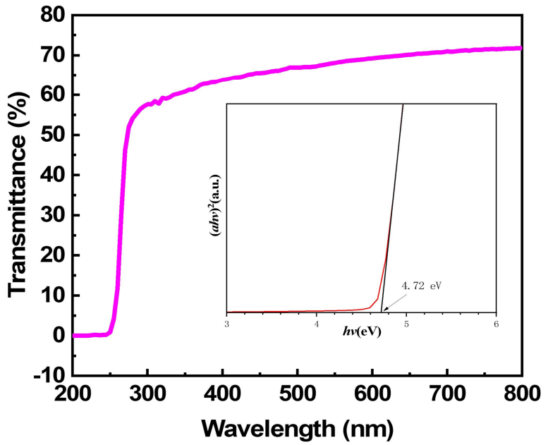 图 6 为 κ-Ga2O3 的光学透射光谱,插图显示了相应的 (αhν)2 - hν 曲线。
