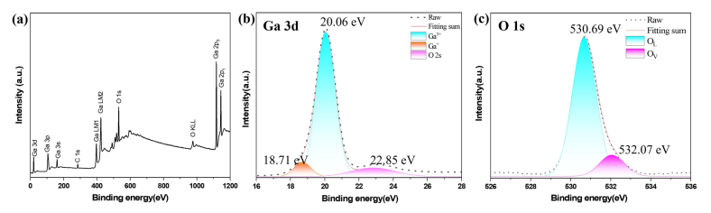 图 5 (a)κ-Ga2O3 外延薄膜的 XPS 全谱;κ-Ga2O3 外延薄膜的 XPS 谱图:(b)Ga 3d,(c)O 1s。