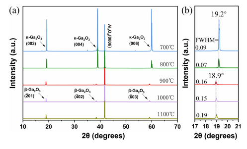图 2 (a)在不同温度下生长的 Ga2O3 外延薄膜的 XRD θ–2θ 扫描图谱;(b)2θ=17–21° 区域的放大视图。
