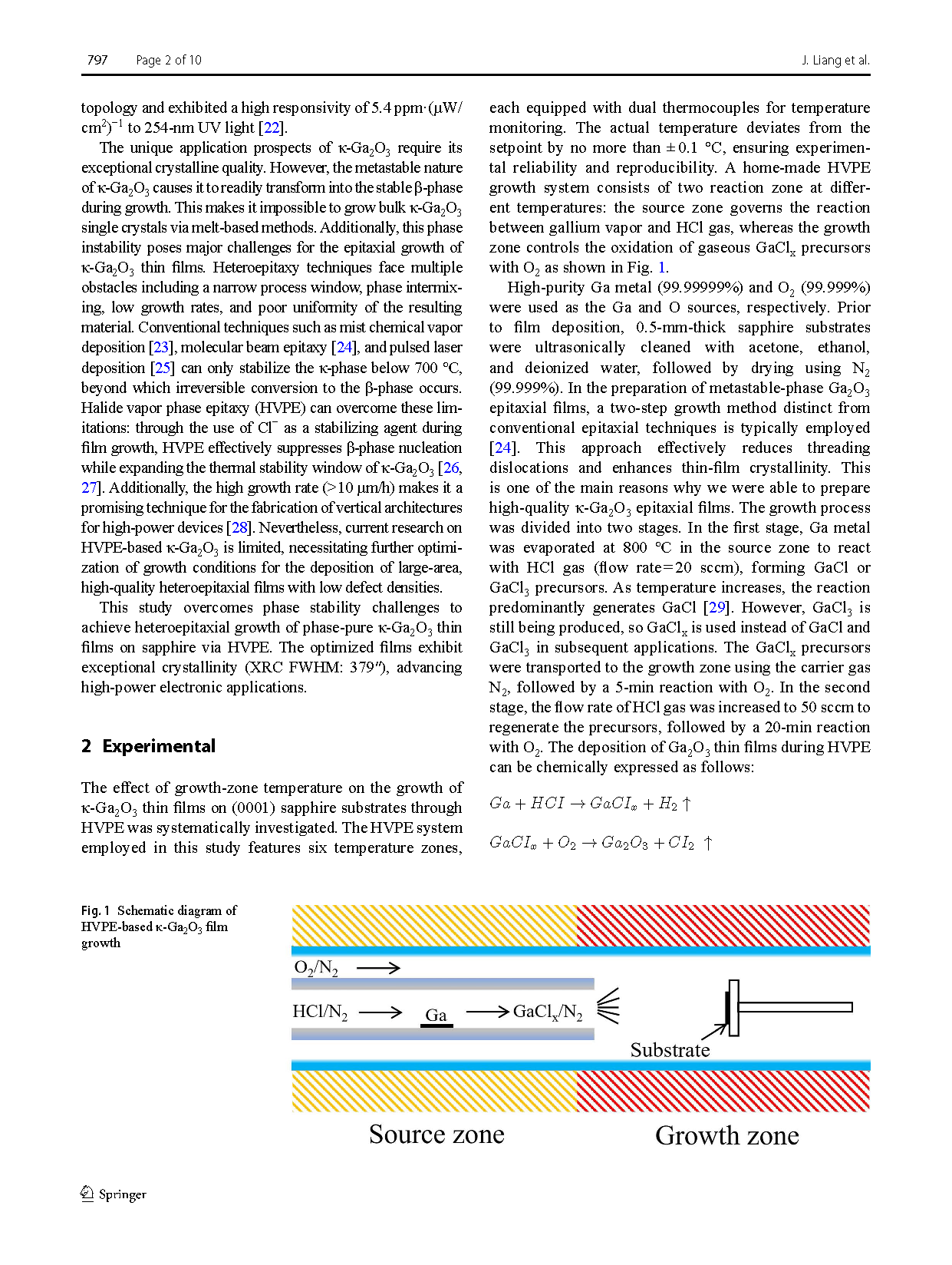 氧化镓(Ga2O3)因其超宽禁带、高击穿场强等优异特性,成为下一代功率电子和深紫外光电器件的关键材料。在 Ga2O3 的多种晶相中,亚稳态的正交相 κ 相因其具有高自发极化和压电特性,在制备高迁移率晶体管和压电传感器等新型器件方面展现出独特的优势。然而,κ 相的亚稳态特性使其在生长过程中极易转变为更稳定的 β 相,这给高质量、纯相的 κ-Ga2O3 外延薄膜的制备带来了巨大挑战,尤其是在需要较高生长速率的氢化物气相外延(HVPE)技术中。目前关于 HVPE 法生长 κ-Ga2O3 的研究有限,需通过优化生长条件来获得大面积、高结晶质量的外延薄膜。