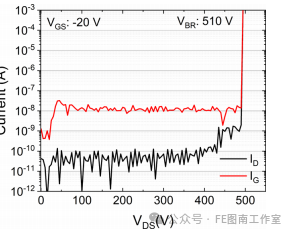 图3. 沟道宽度约65 nm的β-Ga2O3 SFGT器件的击穿特性曲线。