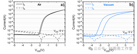 图5. 沟道宽度约90 nm的β-Ga2O3 SFGT器件在(a)空气和(b)390 mTorr真空压力下测量的双扫描半对数转移特性曲线。