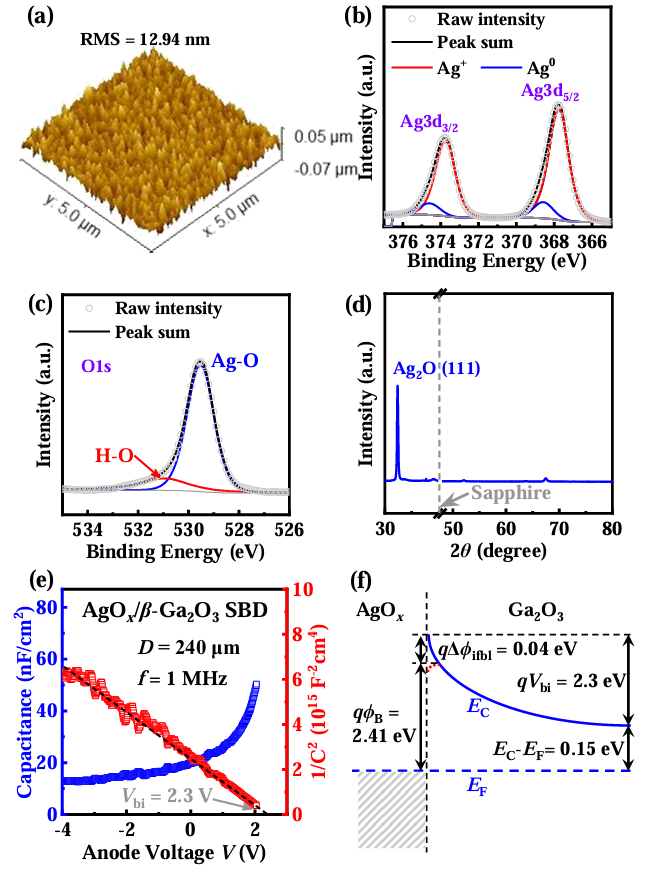 图 2. (a) 5 × 5 μm2原子力显微镜(AFM)图像,(b) Ag3d核心能级XPS光谱,(c) O1s核心能级XPS光谱,(d) 溅射沉积的AgOx薄膜XRD曲线。 (e) AgOx/β-Ga2O3 SBD在1 MHz下的C - V和 1/C2 - V 特性。 (f) AgOx/β-Ga2O3肖特基界面在热平衡下的能带图。