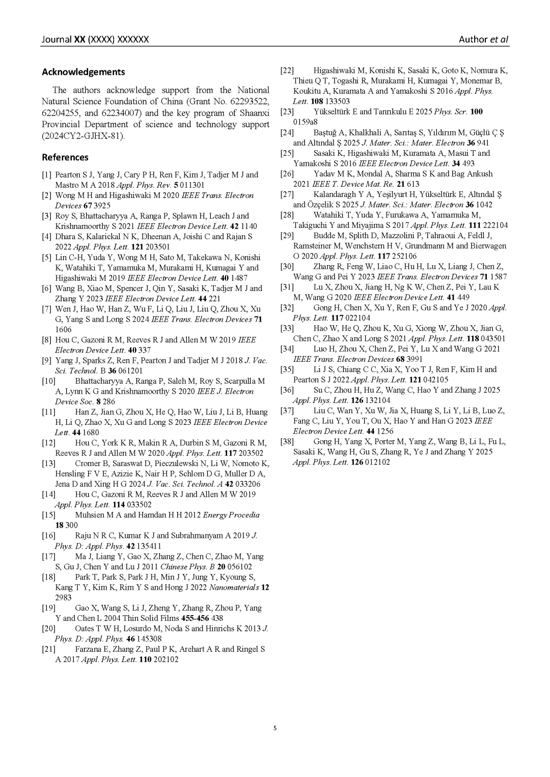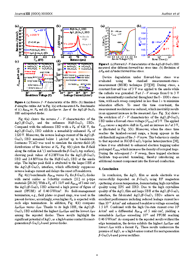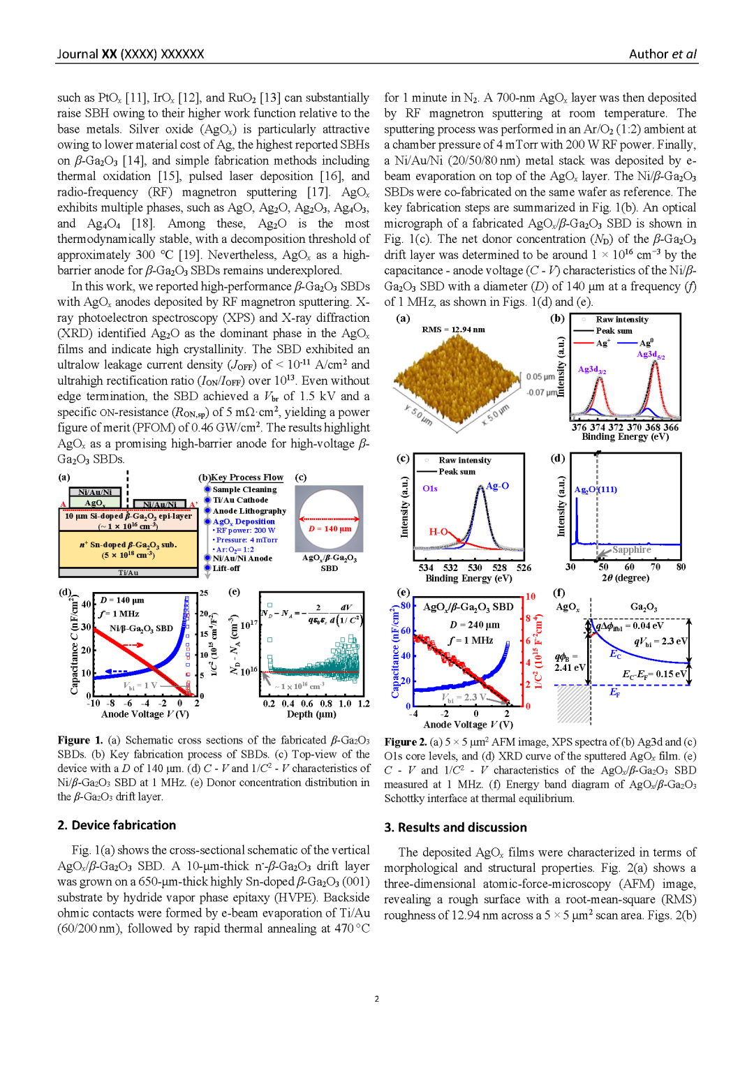总之,本研究成功在β-Ga2O3上通过室温射频磁控溅射沉积了AgOx薄膜作为阳极电极,并通过XPS和XRD验证了其高结晶质量。得益于AgOx薄膜的高结晶性及AgOx/β-Ga2O3界面处的高肖特基势垒高度,制备AgOx/β-Ga2O3 SBD器件表现出优异性能,包括漏电流低于10-11 A/cm2、击穿电压超过1.5 kV。同时,器件具有高导通电流(超过102 A/cm2)和低特征导通电阻(RON,sp = 5 mΩ·cm2),实现了超过1013的开关电流比(ION/IOFF)及0.46 GW/cm2的功率优值(PFOM)。与同样未采用边缘终端的已报道器件相比,该器件在维持合理击穿电压的同时,实现了最高的开关电流比和最低的漏电流。这些结果表明AgOx作为下一代β-Ga2O3功率整流器高势垒接触材料的广阔应用前景。