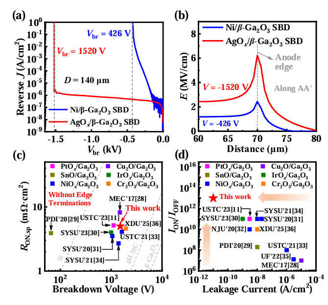 图 4. (a) SBD的反向J - V特性。 (b) 沿AA’切线的电场E模拟结果。AgOx/β-Ga2O3 SBD 与文献报道二极管的性能对比:(c) RON,sp vs. Vbr,(d) ION/IOFF vs. JOFF。