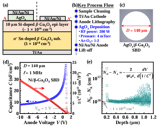图 1. (a) 制备的β-Ga2O3 SBD的器件示意图。(b) 关键制备工艺流程。(c) 器件的光学显微镜照片,直径D为140 μm。(d) Ni/β-Ga2O3 SBD在1 MHz下的C - V和1/C2 - V特性。 (e) β-Ga2O3外延层中的施主浓度分布。