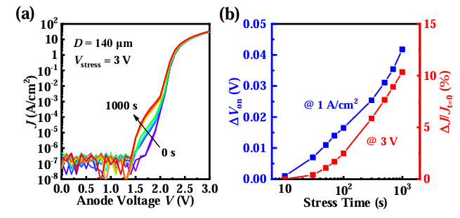 图 5. (a) 在不同正向偏压应力时间下测量的 AgOx/β-Ga2O3 SBD 正向J - V特性。 (b) 正向偏压应力下ΔVon和 ΔJ的演化。