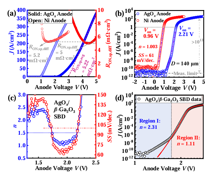 图 3. (a) 制备的直径D为140 μm的SBD的正向J - V特性及提取的差分特征导通电阻 RON,sp。 (b) 正向J - V特性的半对数图。 (c) AgOx/β-Ga2O3 SBD的理想因子n和亚阈值摆幅SS。 (d) AgOx/β-Ga2O3 SBD的拟合结果。