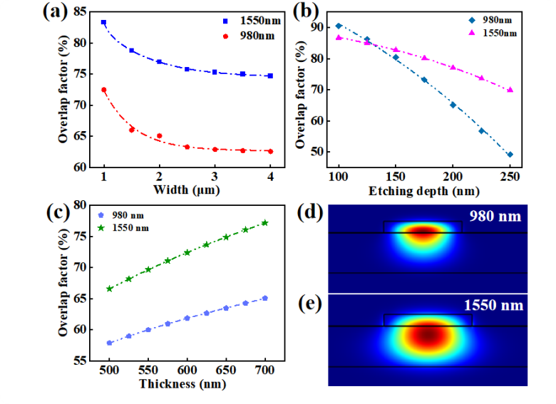 图 1. (a) 波导宽度变化下重叠因子的演变;(b) 腐蚀深度变化下重叠因子的演变;(c) Er3+:Ga2O3 厚度变化下重叠因子的演变;(d) 980 nm 下的光场分布;(e) 1550 nm 下的光场分布。