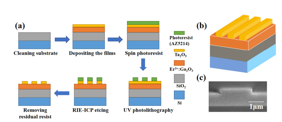 图 2. (a) Er3+:Ga2O3 双层波导光放大器制备工艺;(b) 器件的三维示意图;(c) 波导的 SEM 横截面图。
