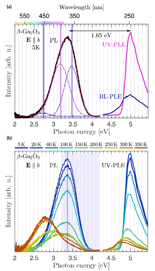 图4.β-Ga2O3 在 b 轴方向平行极化时的 PL 和 PLE 光谱:a) 5 K 条件下;b) 随温度变化的曲线。在 5.0 ± 0.1 eV 激发能下测得宽带 PL 信号,通过三个高斯函数拟合,峰值位置分别为 2.74、3.17和3.47 eV。整体拟合曲线以红色虚线表示,与实际 PL 信号吻合良好。紫外激发光致发光(UVL-PLE)在 5 eV 带隙能量处呈现峰值,而蓝光激发光致发光(BL-PLE)则出现轻微红移并伴随亚带隙信号增强。随温度升高,BL 带强度增大,而两种 STH 带均发生淬灭。
