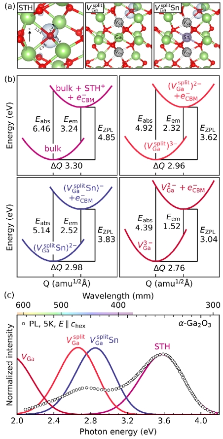 图5.a) 自陷空穴、分裂VisGa、VisGa Sn复合物及常规 VGa 的松弛结构。空穴以蓝色等值面表示,对应最大电荷密度的 5%。b) 孤立空穴极子与缺陷束缚空穴极子(VisGa、VisGa Sn、VGa)在碳基底(CBM)处与自由电子复合引发的光跃迁配置坐标图。c) 对应光跃迁的发光谱线。所有理论曲线均系统性上移 0.27 eV 以使 STH 带与 UVL 带对齐。