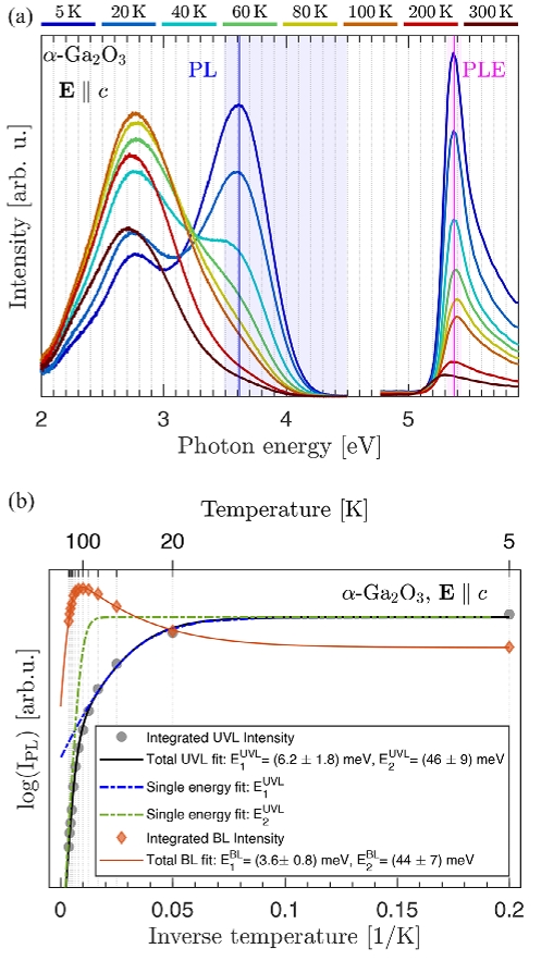图3.a) 5 至 300 K 温度范围内 PL 与 UVL-PLE 光谱的温度依赖性。阴影区域标示用于生成 PL(洋红色阴影)的积分范围(激发能为 (5.37 ± 0.07) eV)及UVL-PLE(蓝色阴影)的积分范围(发射能为 (4.0 ± 0.5) eV)。b) 温度依赖性光致发光积分强度及热淬灭(TQ)模型。蓝光发光(BL)的负热淬灭(NTQ)与紫外光致发光(UVL)在 100 K 以下的热淬灭现象,均由激活能 E1BL 和 E1UVL 描述,两者量级均为 5 meV。