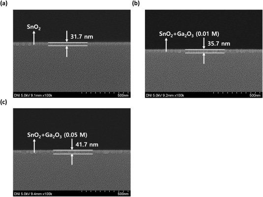 图2. SnO2 薄膜的截面扫描电子显微镜图像:(a)无 Ga2O3 薄膜;(b)带 0.01M Ga2O3 钝化层;(c)带 0.05M Ga2O3 钝化层。